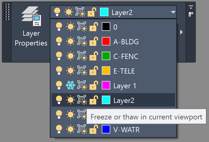 This command does exactly what is sounds like – VP Freezes a Layer in all viewports except the current one. You can activate it by typing LAYVPI in the command line or by clicking the command button on the layer tab.