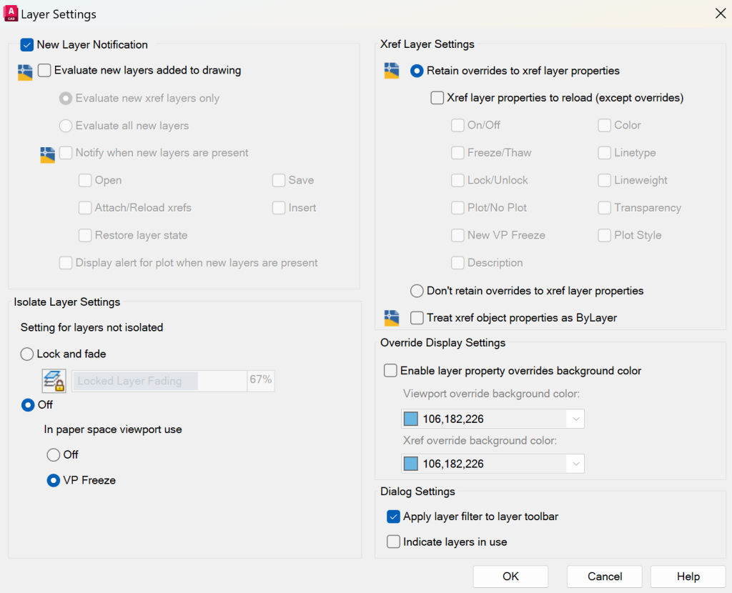 You can edit the following settings in the Layer Settings Dialogue Box: