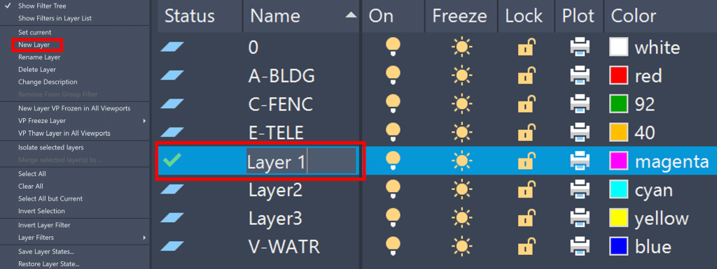 – Home > Layer Tab > Layer Properties Manager > New Layer