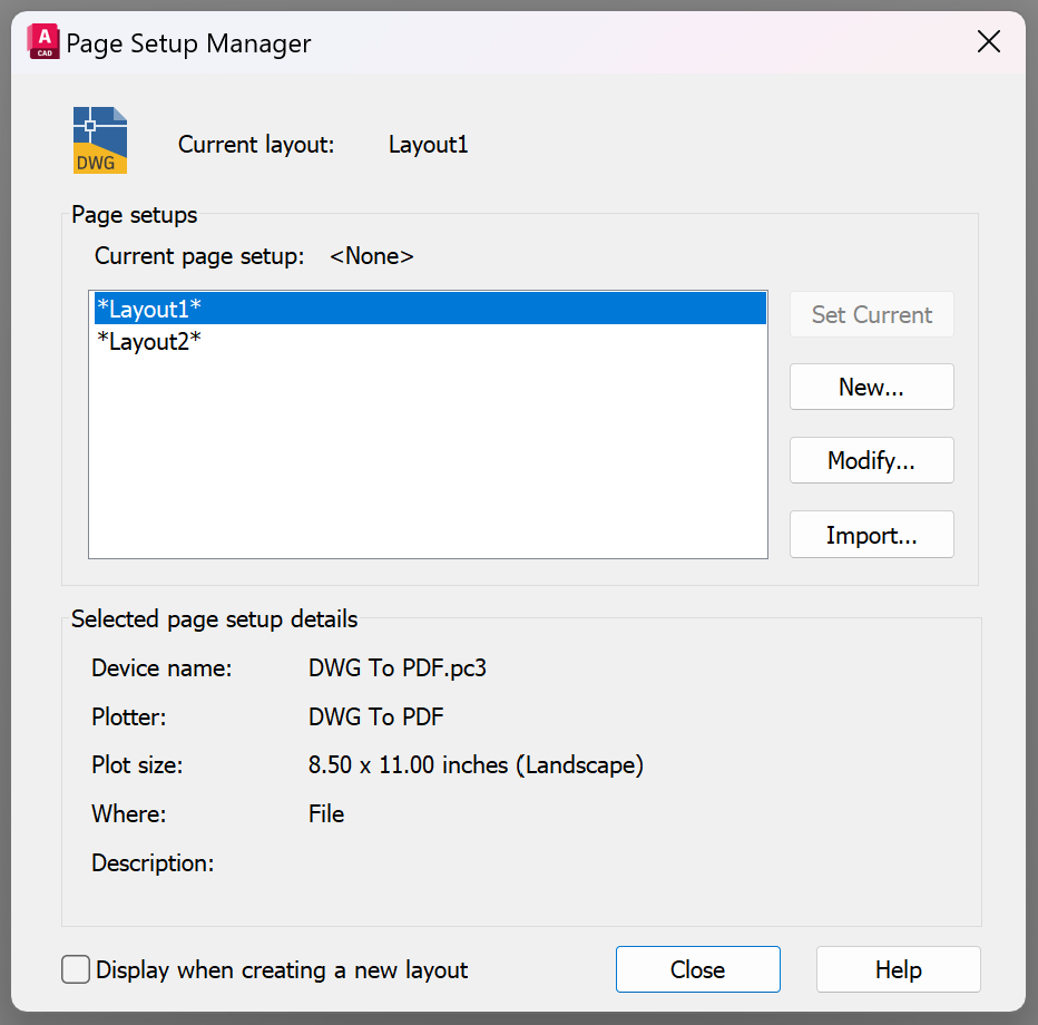 To ensure that the Page Setup Dialog Box opens up each time you create a new Layout Tab, make sure to check the Display When Creating a New Layout button in the lower-left corner of the dialog box.