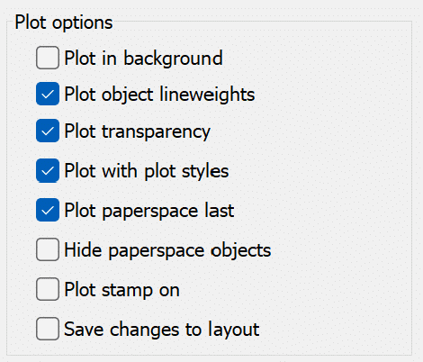 My go-to option is the Layout Option. To learn more about these options in detail or how these options act differently in the model space, checkout the Plot Dialog Box Autodesk 2025 documentation.