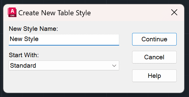 When you click on the NEW button, the Create New Table Style dialog box will open. First, you will need to choose a name for your new style and select a starting style. By default, the STANDARD style is selected. Click CONTINUE and you will be presented with various parameters to help you create the ideal Table Style for your needs. Let’s explore the New Style Dialog Box and various parameters in the New Table Style below:
